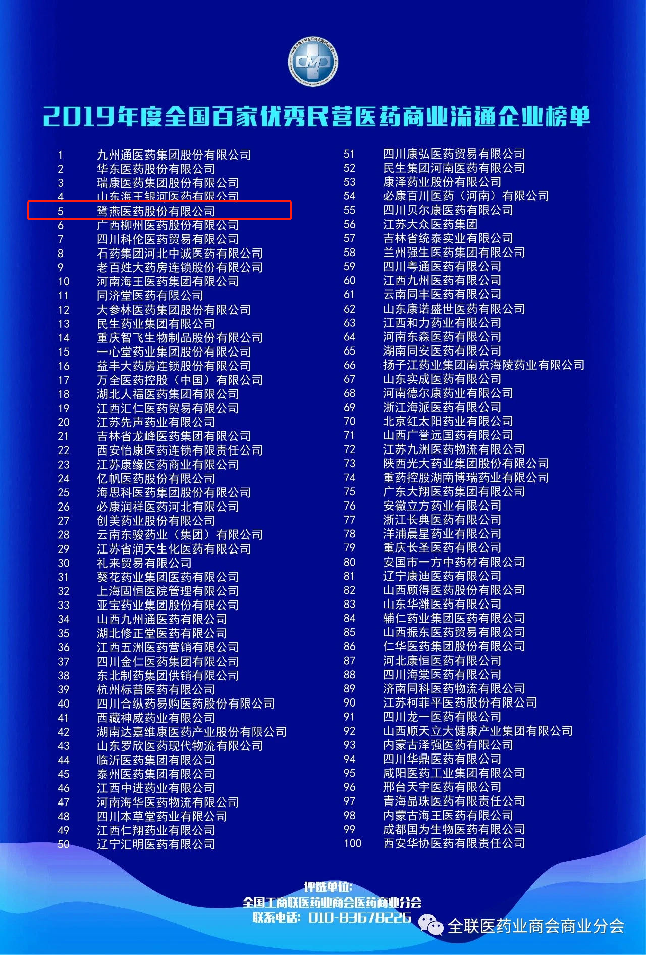2020年9月11日,“第二屆全國民營醫藥商業企業家高峰論壇暨2019年度全國百家優秀民營醫藥商業流通企業榜單發布會”在成都召開。活動現場揭曉了全國百家優秀民營醫藥商業流通企業榜單,鷺燕醫藥股份有限公司(以下簡稱“鷺燕醫藥”)憑借穩扎穩打的優秀實力,榮登榜單第五位。