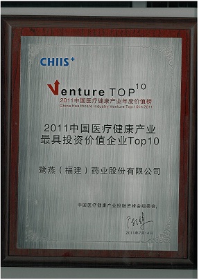 2011年7月14日,在北京舉辦的2011第五屆中國醫療健康產業投融資峰會上,鷺燕(福建)藥業股份有限公司榮獲“2011中國醫療健康產業最具投資價值企業TOP10”稱號。公司于2010年引進建銀國際醫療產業基金等投資者近1.5億元投資后,在公司治理、經營業績、戰略布局等方面得到進一步提升,鞏固了公司在福建省醫藥流通領域的龍頭地位。