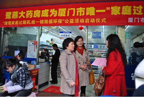 2012年3月15日上午,由廈門市食品藥品監(jiān)督管理局和廈門鷺燕大藥房有限公司聯(lián)合發(fā)起的“清理家庭過期藥、綠色健康倡環(huán)保”公益活動(dòng)啟動(dòng)儀式在鷺燕大藥房前埔分店舉行。本次活動(dòng)的主旨是倡導(dǎo)健康環(huán)保,同時(shí)給廣大人民群眾營(yíng)造一個(gè)安全健康的用藥環(huán)境,有效減少因過期藥品使用給家庭帶來的健康傷害。